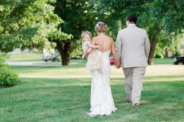 Невеста была в белом свадебном платье, а ее маленькая дочь играла цветами в маминых волосах. Впоследствии девочка заснула и Далтон взяла ее на руки, чтобы ребенку было удобнее.