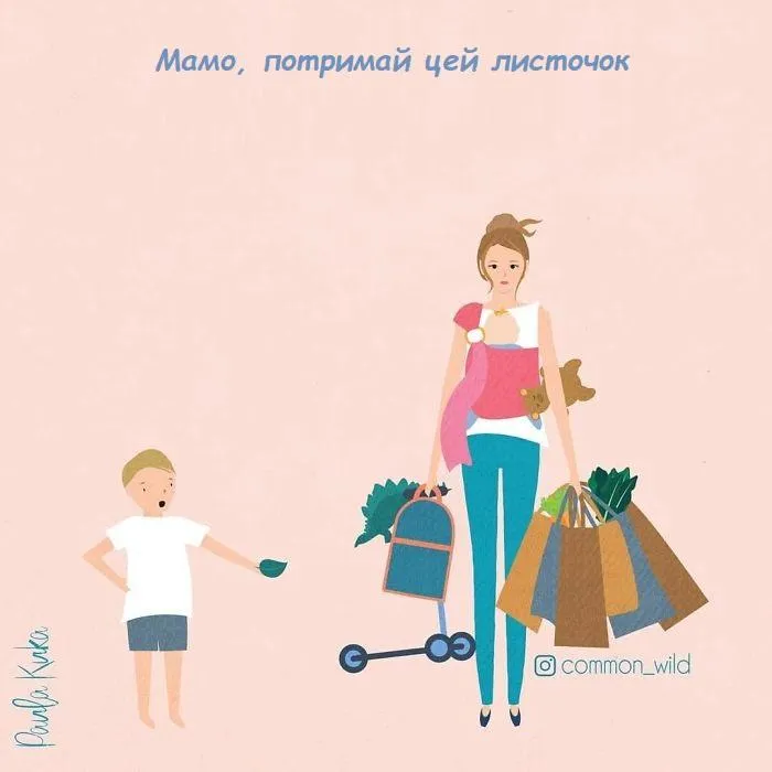 Так, например, на одном комиксе изображено, как мама что-то рассматривает в телефоне во время прогулки с ребенком в коляске.