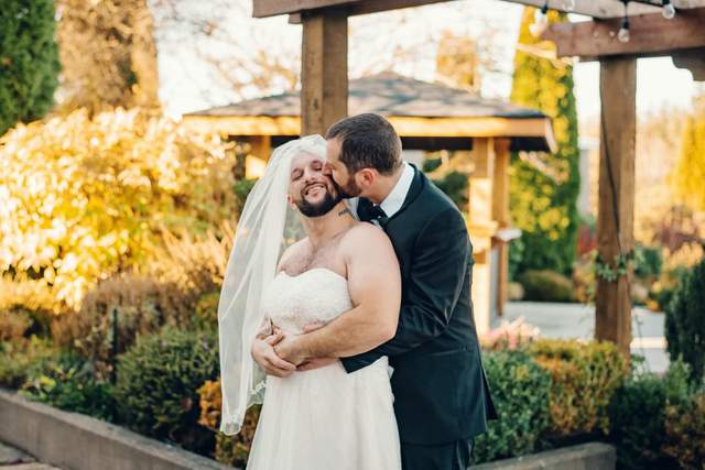 За спиной Дэвида находился его друг – Тимми Хортоном. Он смог втиснуться в свадебное платье и надел фату. Увидев это, жених не смог сдержать смех. Шутка удалась, а фотограф успела зафиксировать бесценные кадры.